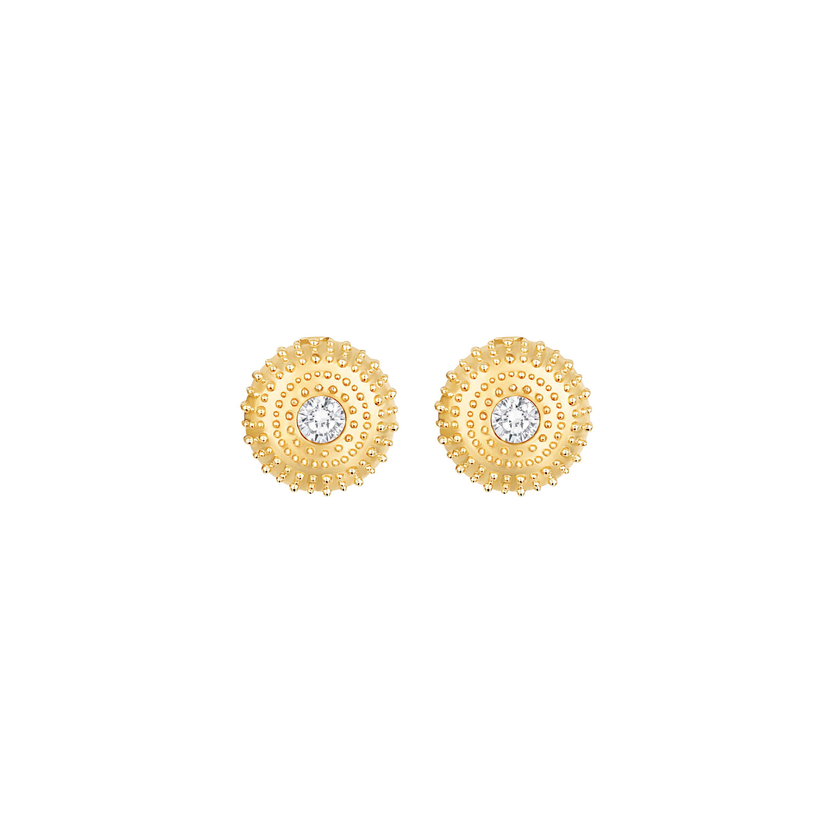 Sea urchin earrings in 22k gold with diamonds or white topaz, showcasing striking finesse and splendor. This exquisite collection is adorned with crystalline gemstones, capturing the essence of oceanic beauty and luxury.